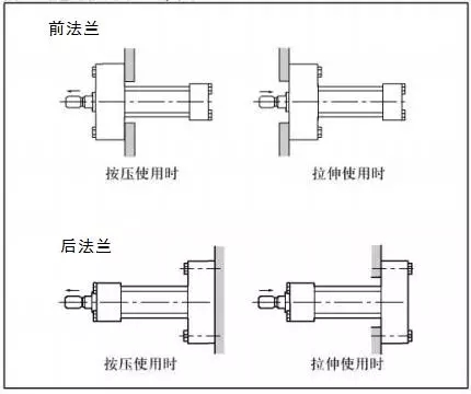 (1)法蘭安裝適合于液壓缸工作過(guò)程中固定式安裝,其作用力與支承中心處于同一軸線的工況;其安裝方式選擇位置有端部、中部或尾部三種,如何選擇取決作用于負(fù)載的主要作用力對(duì)活塞桿造成壓縮(推)應(yīng)力、還是拉伸(拉)應(yīng)力,一般壓縮(推)應(yīng)力采用尾部、中部法蘭安裝,拉伸(拉)應(yīng)力采用端部、中部法蘭安裝,確定采用端部、中部或尾部法蘭安裝需同時(shí)結(jié)合系統(tǒng)總體結(jié)構(gòu)設(shè)計(jì)要求和長(zhǎng)行程壓縮(推)力工況的液壓缸彎曲穩(wěn)定性確定。